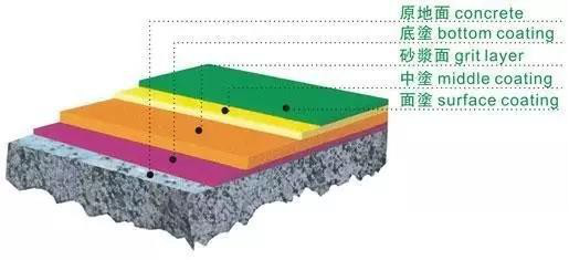五、面 涂 層:待中涂層完全固化后,用磨機磨去突起的顆粒等雜物,然后清掃、除塵,再將無色透明的環(huán)氧面涂料調(diào)配均勻后用鏝刀平鏝在中涂層上。